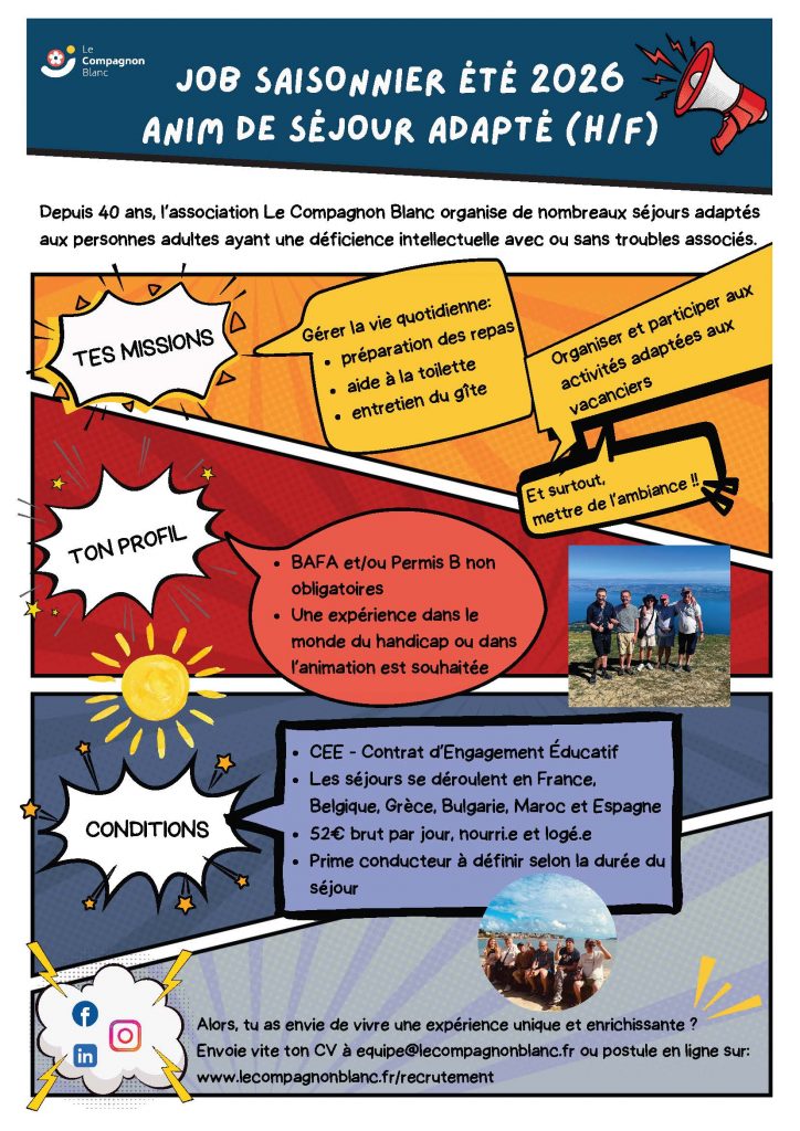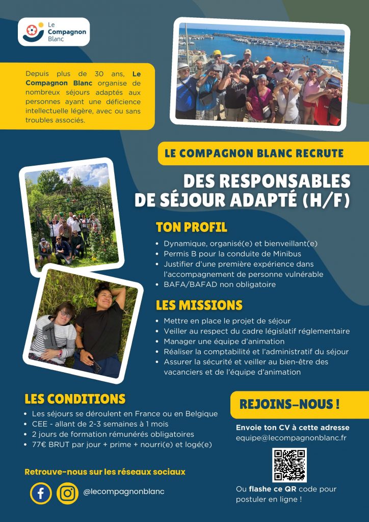 Tu as envie de vivre une expérience professionnelle unique ? Alors notre association a peut-être quelque chose pour toi ! Nous recrutons fréquemment des animateurs et animatrices afin d’encadrer nos séjours de vacances adaptées et/ou nos sorties week-end. Nous recrutons également des responsables de séjours (H/F) pour nos séjours d’été !